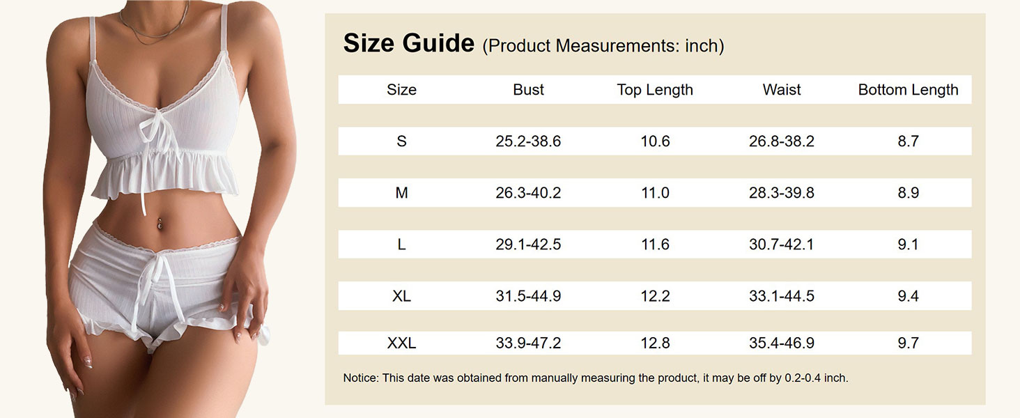- Ruffle hem, lace trim, adjustable spaghetti straps, knot front, V neck bralette.